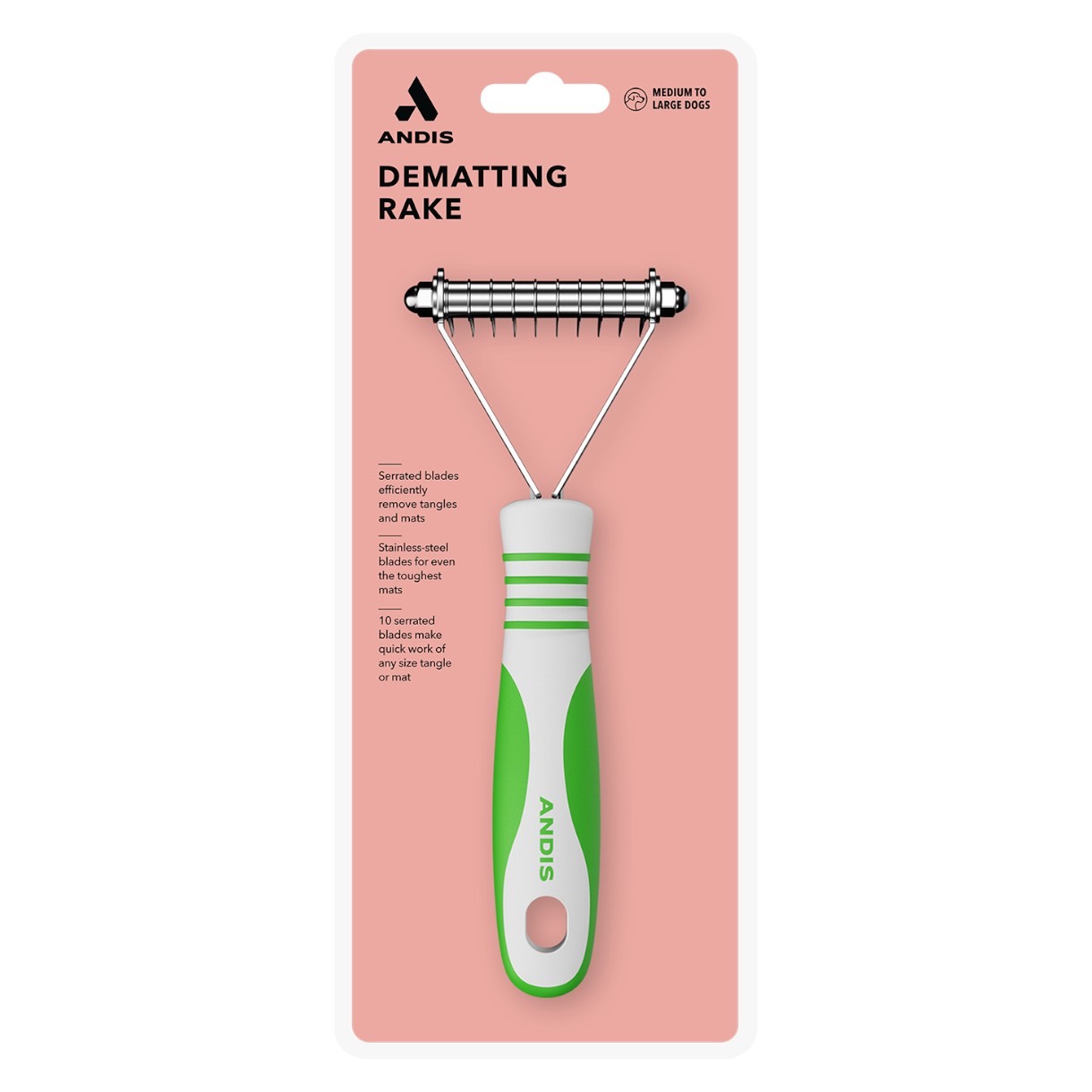 Andis udfiltringskam er specialdesignet til pleje af langhårede racer. De kraftige, rustfrie stålklinger glider let gennem filtrede pelse og løsner selv de mest genstridige knuder uden besvær.