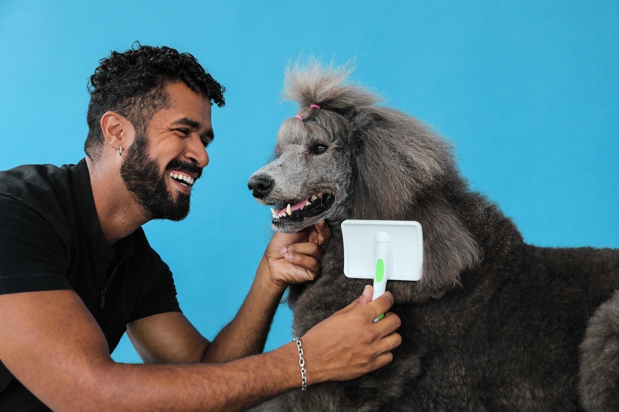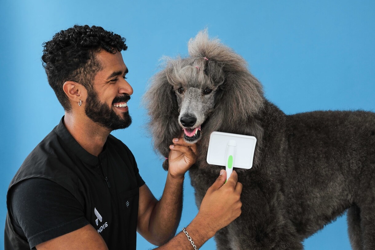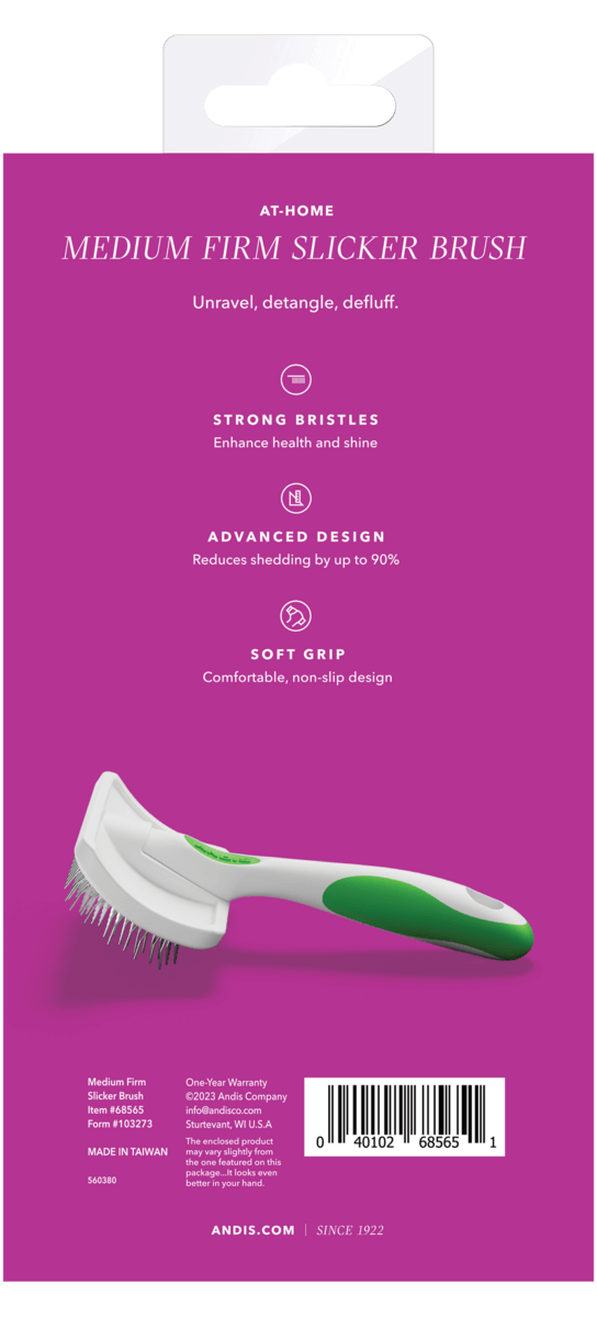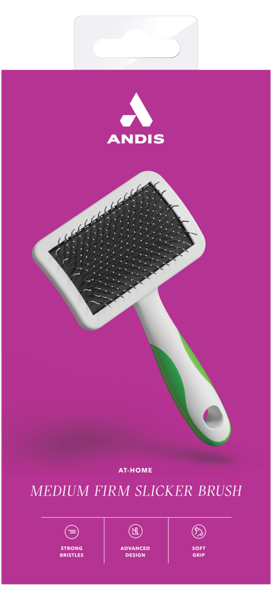 Andis' mellem store karte glider ubesværet gennem alle pelstyper – fra silkebløde dækhår til tæt, filtret underuld. Børsten gør det let at: