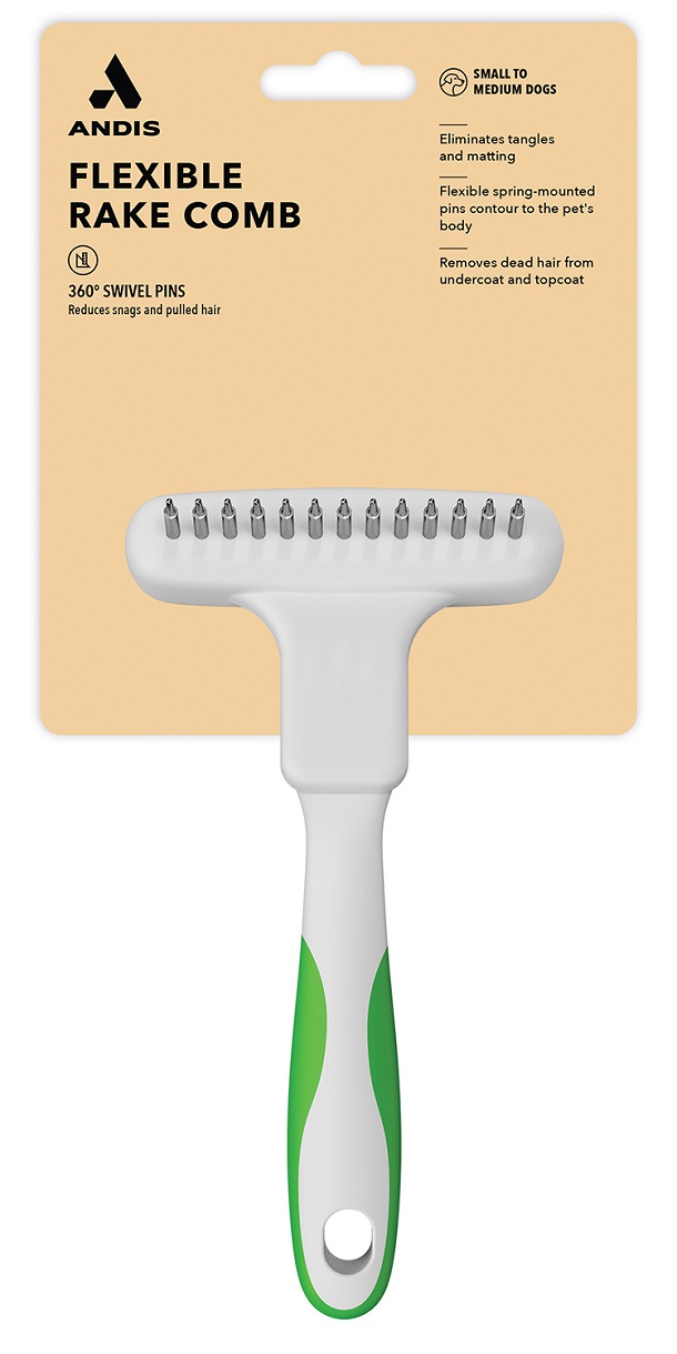 Andis udfiltringskam med fleksible tænder, specialdesignet til pleje af små og mellem størrelse racer. De kraftige, rustfrie tænder er roterende og kan affjedre, så de nemmest muligt glider igennem filtrede pelse og løsner selv de mest genstridige knuder uden besvær.