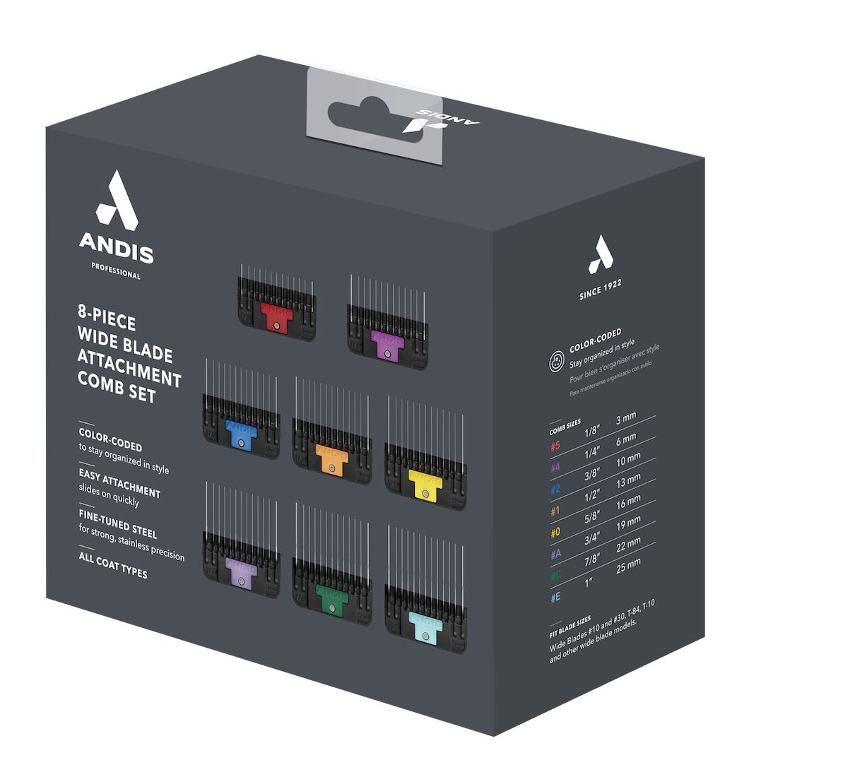 Bemærk, afstandskammene passer kun på ekstra brede skær, som Andis skær 10W, 30W, T-10, T-84