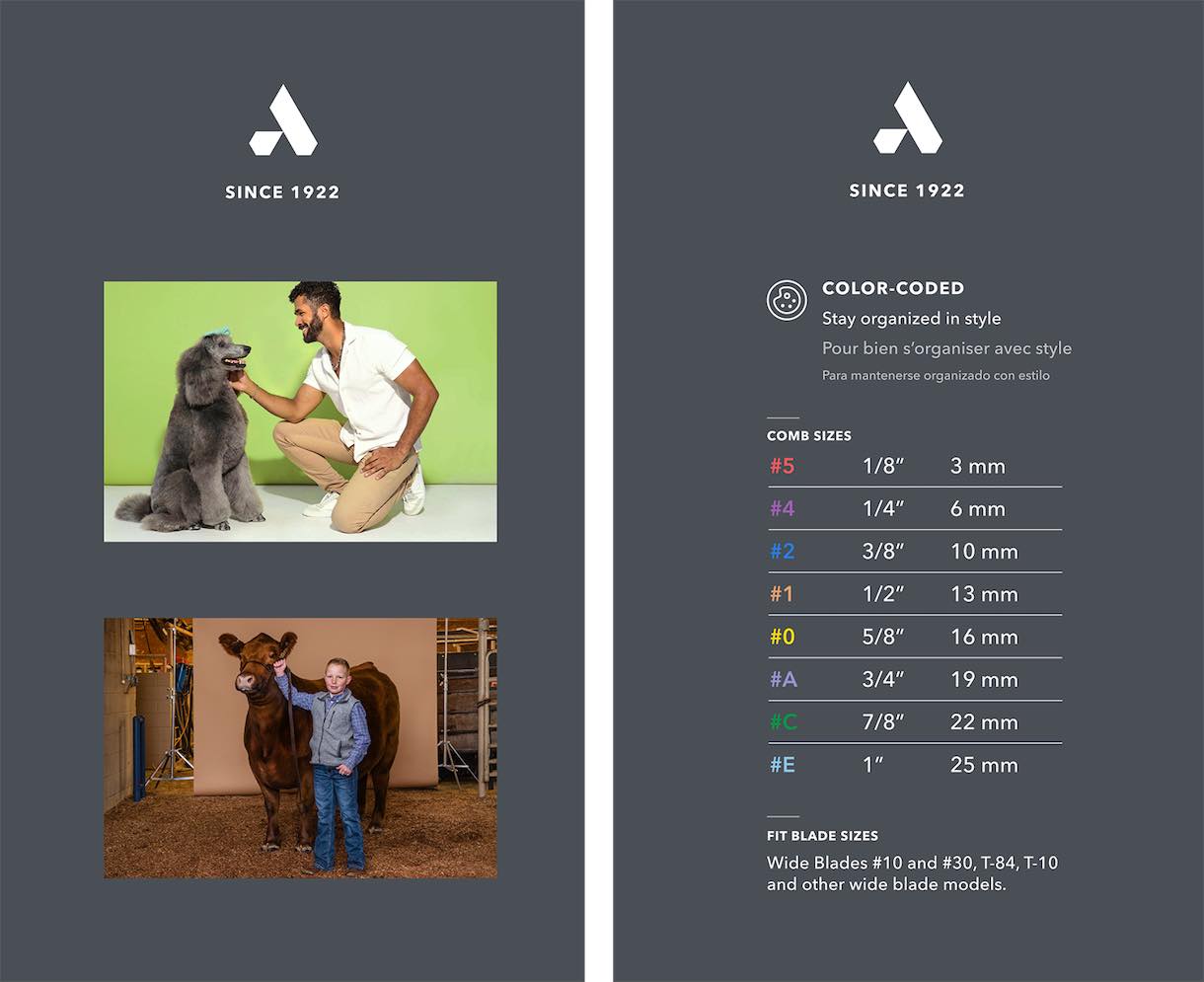 Andis: Pulse ZR, beSPOKE, eMERGE, AGC, AGC-2, AGR, AGR+, AG, MBG, AGRC, AGRV, SMC-2, Pro-Animal EBC, Power groom+, Endurance, ProPet, Excel 2, Excel 5
