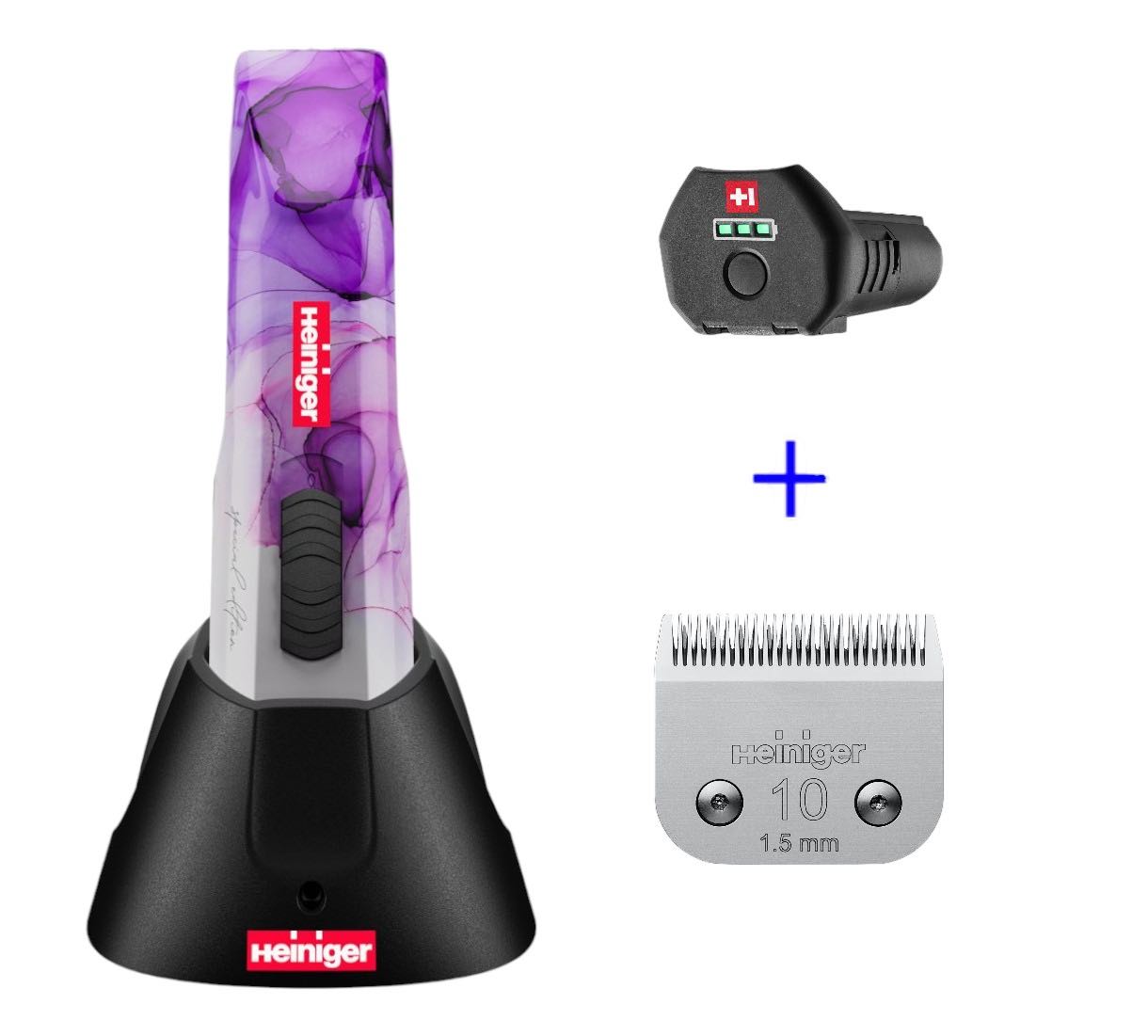 Leveres i en papæske inkl. 1 batteri, bordlader, Heiniger skær 10 (1,5mm) red line, olie, børste og brugsanvisning.
