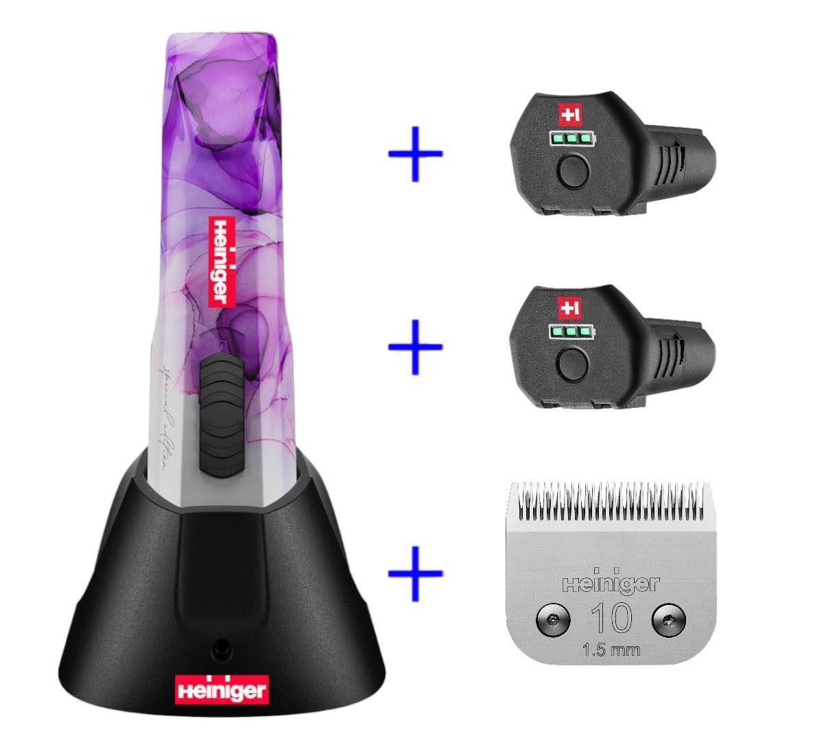 Leveres i en papæske inkl. 2 batterier, bordlader, Heiniger skær 10 (1,5mm) red line, olie, børste og brugsanvisning.