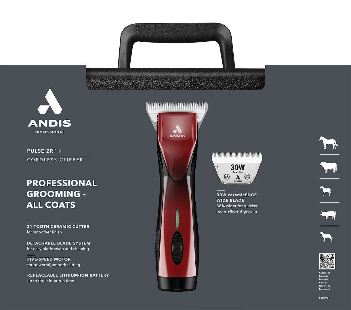 Udstyret med en kraftfuld femtrinsmotor er Pulse ZR II en robust arbejdshest, der klarer alle dine klippebehov. Nu er den opgraderet med et størrelse 30W CeramicEdge bredt skær, som giver den perfekte kombination af hastighed, kraft og effektivitet. Med en bredde, der er 36 % større, og 16 % flere tænder end standardskær, dækker det brede skær et større område hurtigere, så du kan færdiggøre klipningen på kortere tid. Den keramiske skæredel med 31 tænder holder sig køligere og skarpere i længere tid, mens det unikke tandmønster forbedrer hårtilførslen og sikrer en glattere finish. Designet til brug hele dagen – justér hastigheden, så den passer til enhver pelstype eller trimning.