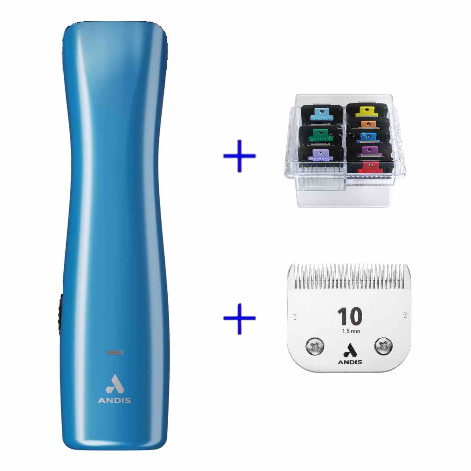 Lev inkl. Andis skær nr. 10 (1,5mm) i rustfri stål, Andis afstandskamsæt, lader 100-240 Volt, Dansk brugsvejledning, olie og børste.