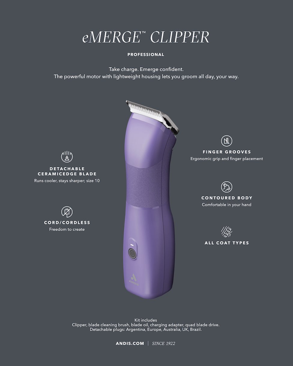 Klipperen er for hundefrisører og hundeejere der ønsker en kraftig klipper med høj hastighed, samt en høj grad af fleksibilitet. Klipperen er designet til at kunne klippe hele dagen, idet den båd kan køre med og uden ledning, samt har en ergonomisk udformning. Den ergonomiske udformning reducerer både håndbelastningen og gør at man kan opretholde kontrollen igennem hele klippesessionen. Der er altså ingen grænser for hvor længe man kan klippe ad gangen med Andis eMERGE.